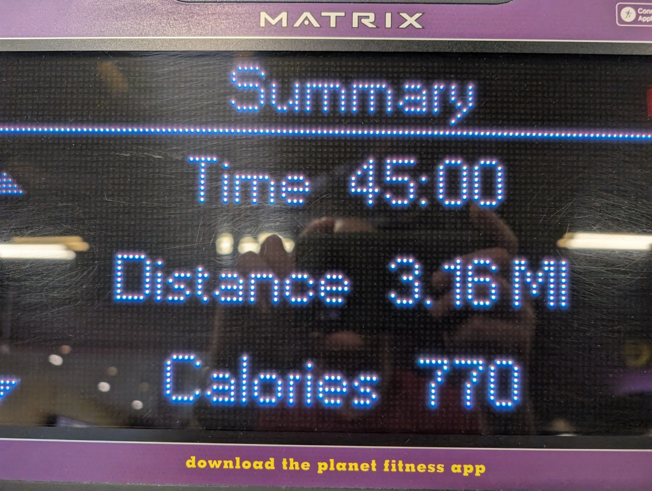 Those calories are a lie, by the way. I figured maybe 500 for 40 minutes of 65-percent incline, resistance level of 13.